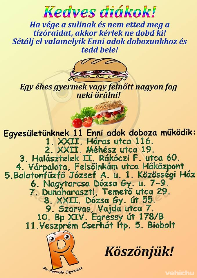 Örömteli hír, hogy Veszprémben is elkészült az első Enni adok-enni kapok szekrény a Cserhát lakótelep 5. szám alatt található épület oldalán, amit a lelkes diákok el is kezdtek feltölteni. Persze egy kis harapnivaló mindig jól jön, így ha szeretne segíteni a rászorulóknak, Ön is elhelyezhet ételt a dobozban.