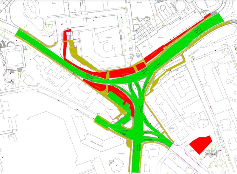 Az érintett csomópontok minden irányban járhatóak maradnak a meglévő jelzőlámpás forgalomirányítás megtartása mellett.
