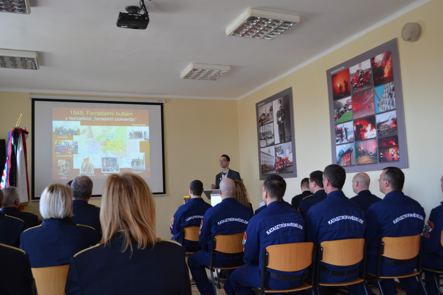 Az állománygyűlésen Barta Tamás történész mondott ünnepi beszédet, melyben a szabadságharc kiemelkedő alakjairól, a márciusi ifjak bátor tetteiről emlékezett meg. Beszédében kiemelte, az akkor lefektetett alapok a manapság is irányadók lehetnek, hiszen a ránk ruházott értékeket felelősséggel tovább kell adnunk az utánunk jövő nemzedéknek is.