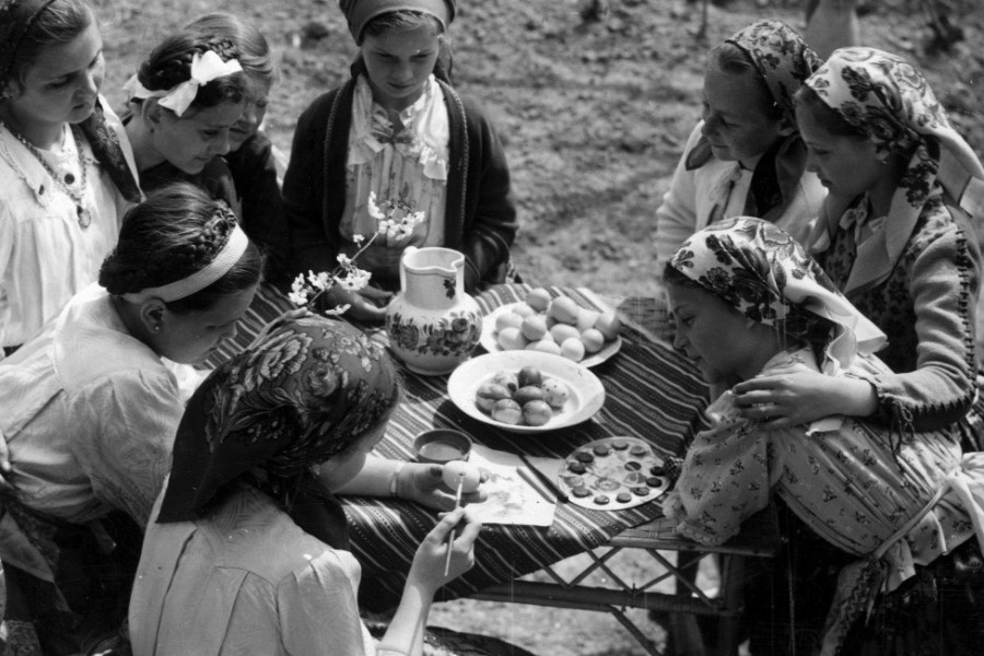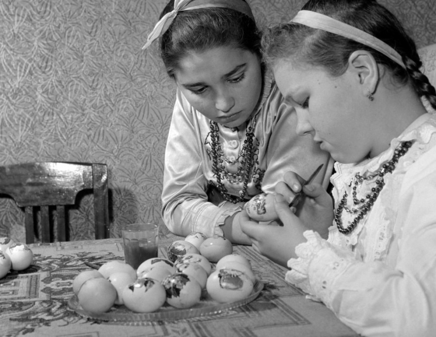 Egy régi pillanatkép Tápéról, 1961. március 20-ról. Miklós Ilonka és Dávid Ilonka húsvéti tojásokat fest az egyik házban. MTI Fotó: Tóth Béla