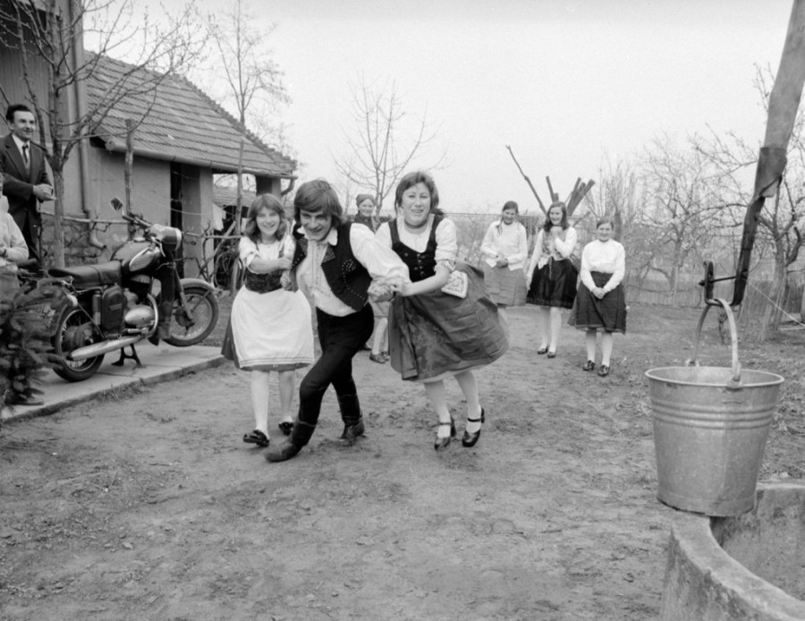 Vagy lefogták a fiúkat. /Fotó: Hévízgyörk, 1975. március 31. A húsvéti locsolást akadályozni próbáló lányok húsvéthétfőn egy ház udvarán. MTI Fotó: Fehérváry Ferenc