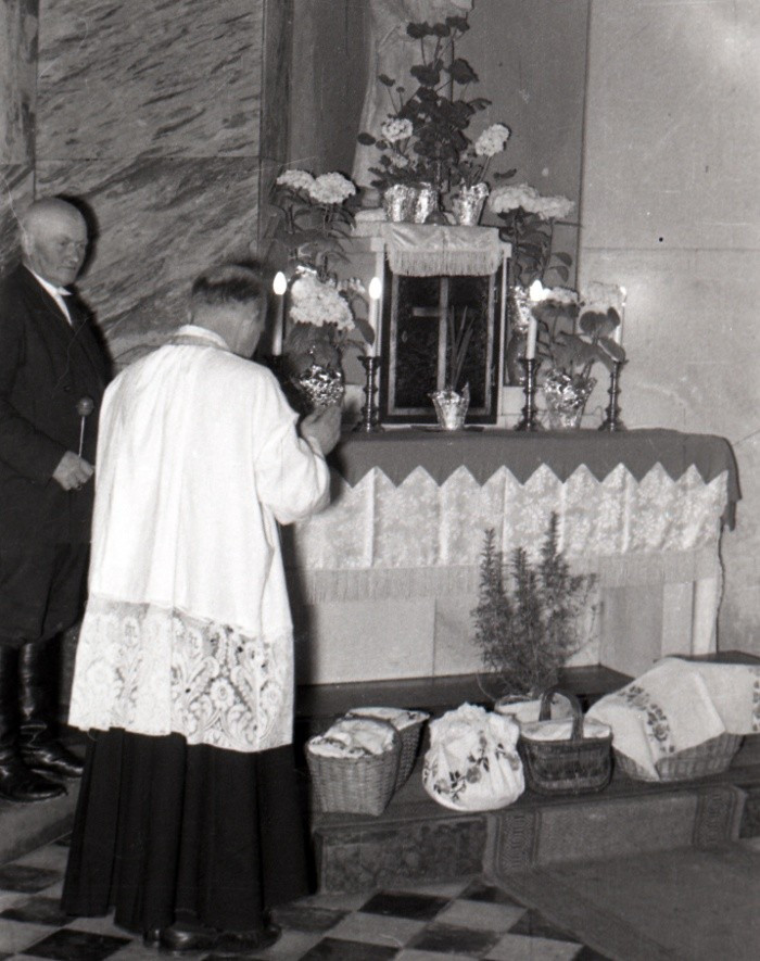 Húsvét vasárnap a falu népe elindult a templomba, ahol a pap megszentelte a húsvéti kalácsot és sonkát. /Fotó: Molnár Balázs, 1963. 04., Domaháza, Néprajzi Múzeum