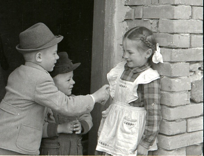 Fotó: Egy kislány locsolkodó kisfiúkkal. Molnár Balázs, 1959. 03., Domaháza, Néprajzi Múzeum