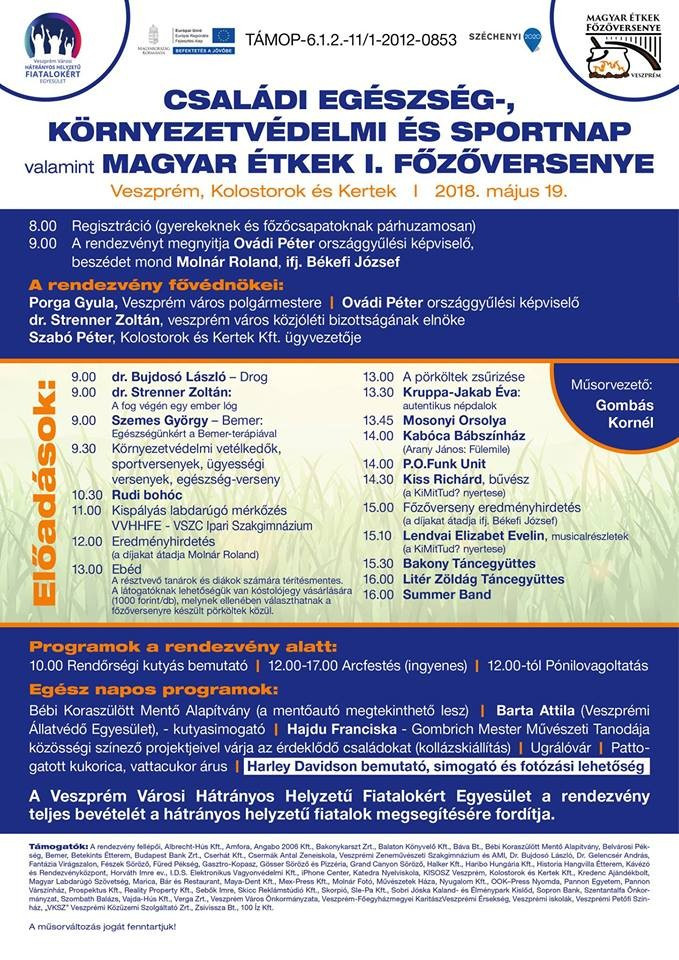 A Kolostorok és Kertek rendezvénytéren hetedik alkalommal tartja meg jótékonysági napját a Veszprém Városi Hátrányos Helyzetű Fiatalokért Egyesület. A civil szervezet a hivatalosan Családi Egészség-, Környezetvédelmi és Sportnap nevű esemény teljes bevételét a hátrányos helyzetű fiatalok megsegítésére fordítja. A támogatók részére idén rendezik meg először a Magyar Étkek Főzőversenyét - mondta a hétfő délelőtt tartott sajtótájékoztatón Molnár Roland, az egyesület elnöke, aki kiemelte, hogy minden résztvevő ingyenesen vállalta a közreműködést.