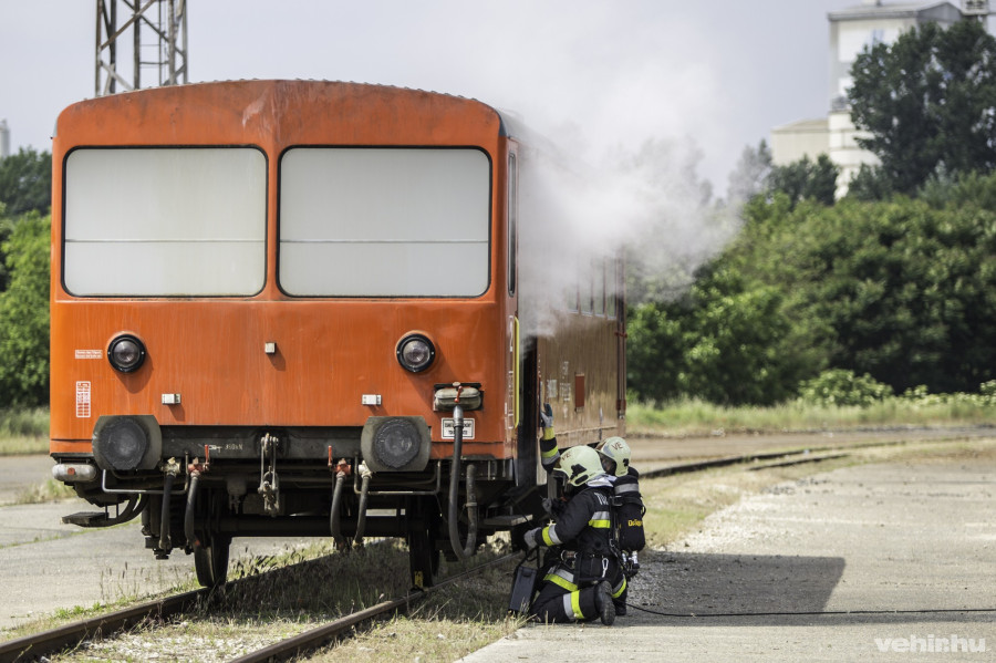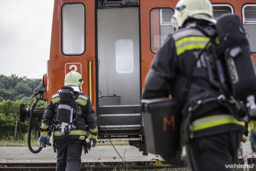 Ezen a helyszínen a vegyi mentő konténer támogatásával úgynevezett „A” típusú védőruhában avatkoztak be a veszprémi hivatásos tűzoltó-parancsnokság tűzoltói. A felderítést követően a Bakonykarszt Zrt. szakembereivel egy mentesítő kapszulába zárták a veszélyes anyagot tartalmazó sérült palackot, majd a megfelelő mentesítés után már indultak is a következő kárhelyszínre, ahol pedig egy füsttel telítődött motorvonat utasteréből kellett két súlyos, salétromsav mérgezést szenvedett sérültet kimenteniük.