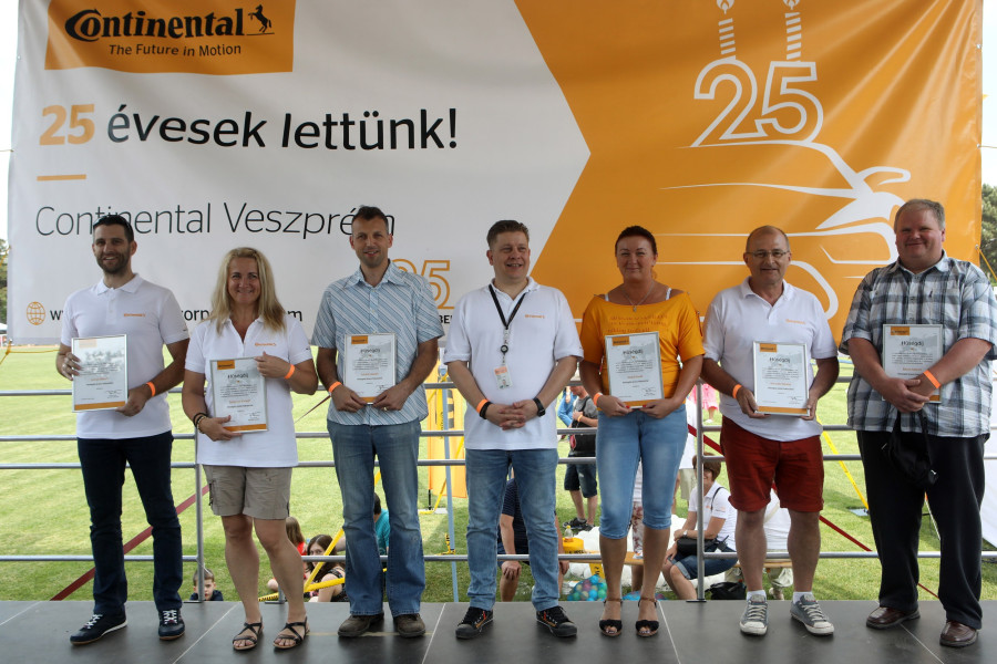 Idén is megkapták megérdemelt kitüntetésüket a Continental leghűségesebb dolgozói. A díjakat Pápai Tamás ügyvezető igazgató adta át a hat ünnepeltnek, a kollégák kitartó tapsa és éljenzése közepette. A vállalati hűségdíj bronz fokozatát Bazsó Gábor és Léránt László, ezüst fokozatát Solymosi Tímea és Horváth Mihály, arany fokozatát pedig Szalai Ilona és Lovas Gábor vehette át.