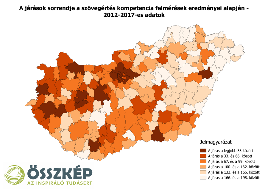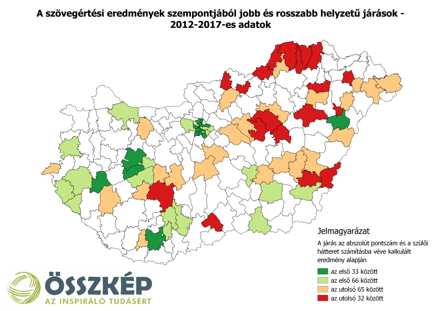 A lista élén nyolc budapesti kerület, illetve a Budakeszi és a Balatonfüredi járás áll. Ezekben a járásokban 1560 vagy több a diákok átlagos pontszáma. A lista végén Gönc, Szikszó és Kunhegyes környéke 1320 alatti pontszámmal. A diákok szövegértése a fővárosi agglomerációban, a Balaton mentén és az ország északnyugati részén, illetve a három nagy egyetemi városban - Pécsett, Szegeden és Debrecenben - a legjobb. Az ország északkeleti része és a Dél-Dunántúl szegényebb részein pedig a legrosszabbak az eredmények.