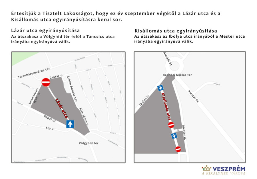 Egyirányúsítják a Lázár utcát és a Kisállomás utcát Veszprémben