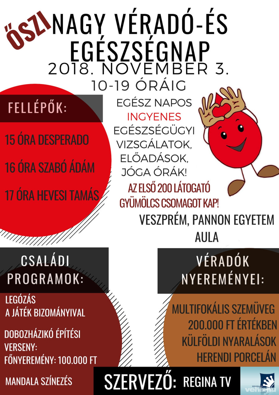 Az utóbbi évek sikeréhez hozzájárult, hogy az önzetlen jószándékot értékelvén, a rendezvény kilépett a fehér csempék és a kórházi ágyak világából és egy sokszínű programmá duzzadt, ahol a segítség köszönetet, ünneplést és jutalmat érdemel. A véradók között külföldi utakat, herendi porcelánt és értékes multifokális szemüveget is kisorsolnak a napot pedig a Desperado, Szabó Ádám és Hevesi Tamás koncertje koronázza meg.