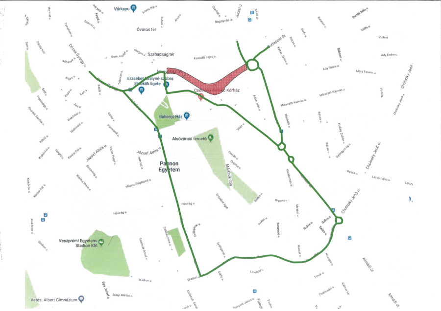 A Budapest út irányából érkező gépjármű forgalom a Dózsa György utca irányába az Almádi út – Cserepes utca (belső elkerülő) – Stadion utca (belső elkerülő) – Egyetem utca – Iskola utca útvonalon jut el.