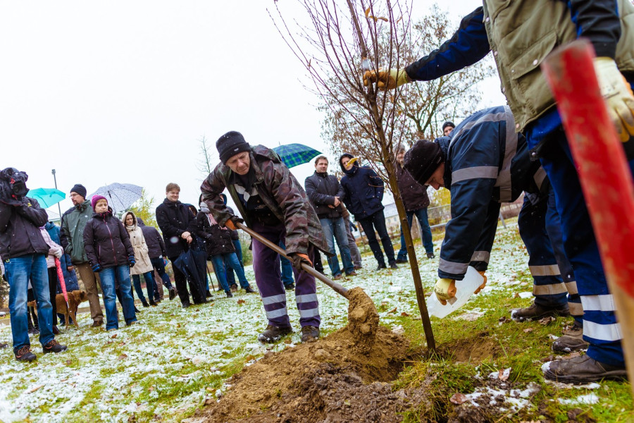 Enyhe hóesésben ültettek oszlopos gyertyánt hétfő délelőtt a VKSZ Zrt. munkatársai a volt SZMT-székház előtti parkban. A Magyar Turisztikai Ügynökség mind a 324 pályázó településnek egy-egy facsemetét adományozott.
