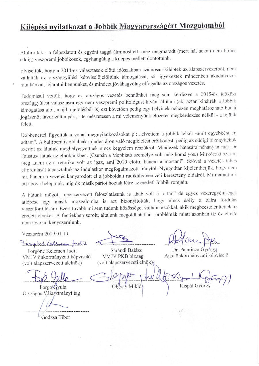 A Jobbikból távozó tagok az alábbi nyilatkozatot juttatták el szerkesztőségünkhöz: