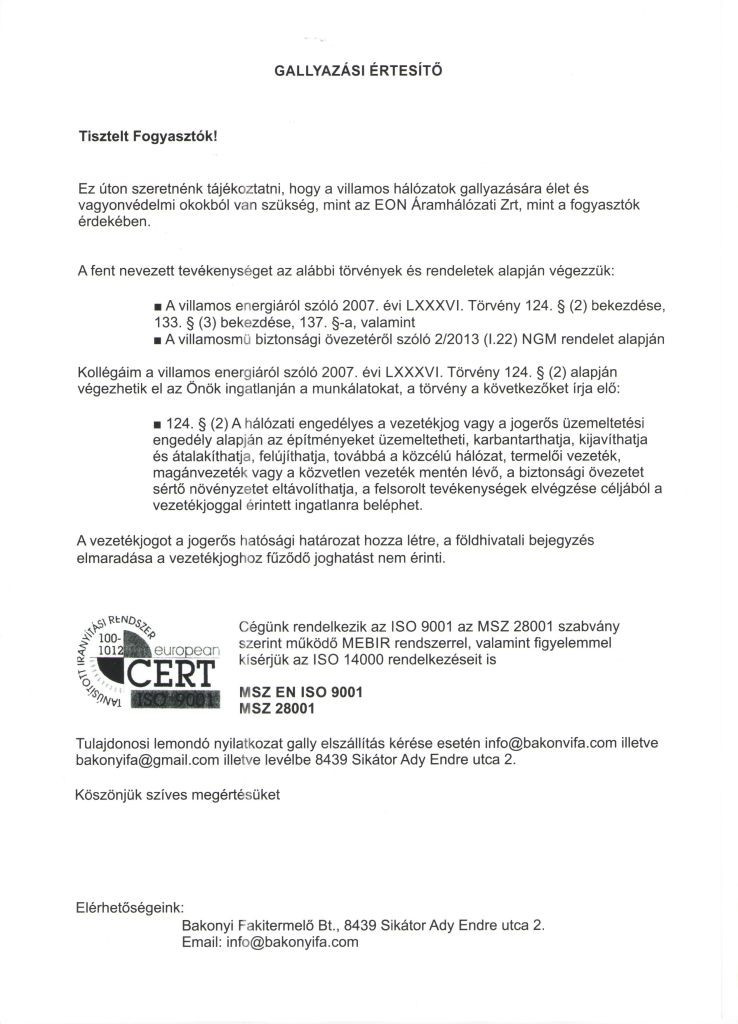 A gallyazási munkák közérdekű munkálatok, amelyek elvégzése élet- és vagyonvédelmi okokból történik. Kérjük a munkálatok végzése alatt szíves megértésüket. Amennyiben észrevételük van, az alábbi elérhetőségeken tehetnek bejelentést: