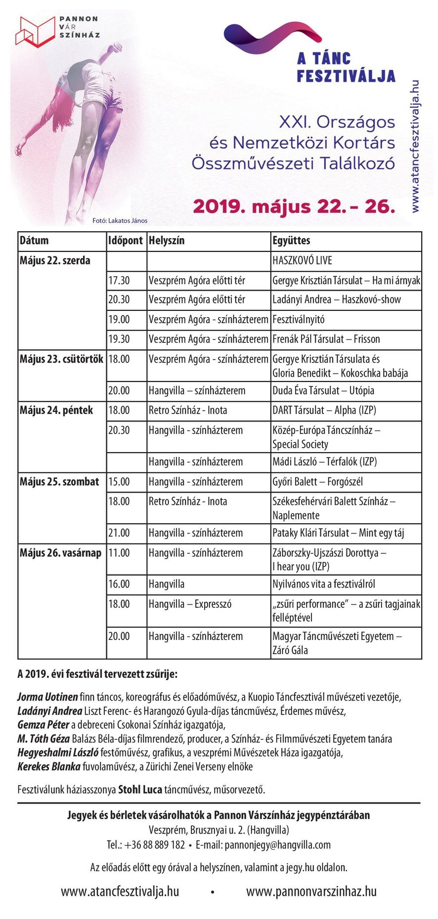 Az idei fesztivált már az Európa Kulturális Fővárosa eszmeiségét figyelembe véve szervezték meg, így olyan helyszíneken is találkozhatunk a táncosokkal, ahová korábban még nem tette be a lábát a rendezvény. Jó példa erre a Haszkovó lakótelep, ahol ezúttal nemcsak az Agórában, hanem a városrész más pontjain is belefuthatunk az előadásokba. Szerdán 17:30-tól például a Táborállás parkban a GK Társulat, 20:30-tól a Stromfeld 5/D lakóház tűzfala előtt Ladányi Andrea, csütörtökön 18 órától az Agórában a GK Társulat egy-egy előadása várja az érdeklődőket.