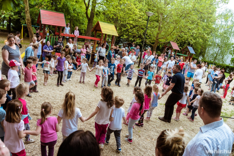 A jó hangulatú táncházhoz egyre többen csatlakoztak: szülők, ovisok és óvónők hatalmas kört alakítva változtatták színpaddá a délutáni mindennapos játék fő helyszínét.