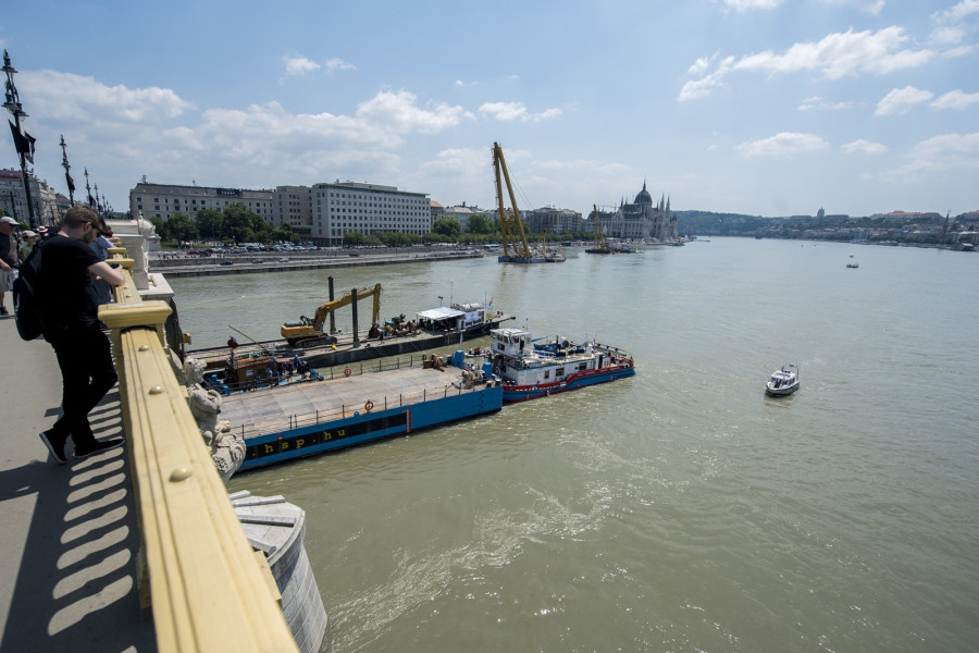 Jasenszky Nándor elmondta, hogy a négy bekötési ponton az úgynevezett befűző köteleket átvezették, az egyik oldalon a kiemelésben résztvevő bárkához rögzítették. A másik bárka, ahova a kötelek másik végét erősítik majd, most foglalja el a helyét - ismertette a részleteket.
