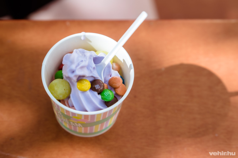 Az amerikai tinifilmek klasszikus pillanata, amikor az édes cukrokat a tartály alá állva egyenesen a szánkba töltjük, ami ugyan filmen jól néz ki, a valóságban felvet néhány logisztikai kérdést. Kisebb mértékben, de hasonlóan hedonista érzés az is, amikor az ember egy gyümölccsel, M&M-sel, szórócukorral vagy éppen Oreoval megpakolt fagyi kelyhet kanalaz. Hogy aztán ebből mennyit pakolunk a fagyinkra, az csak rajtunk áll: hatféle feltét közül választhatunk, a végleges ár pedig az extrákkal megpakolt édesség súlya alapján számolódik. Az alap fagyi íz tulajdonképpen hagyományos, de a feltétek pluszt visznek bele, a 450 Ft/10 dkg-os ár pedig szerintünk teljesen korrekt a gombócos fagyi mennyiségéhez mérve.