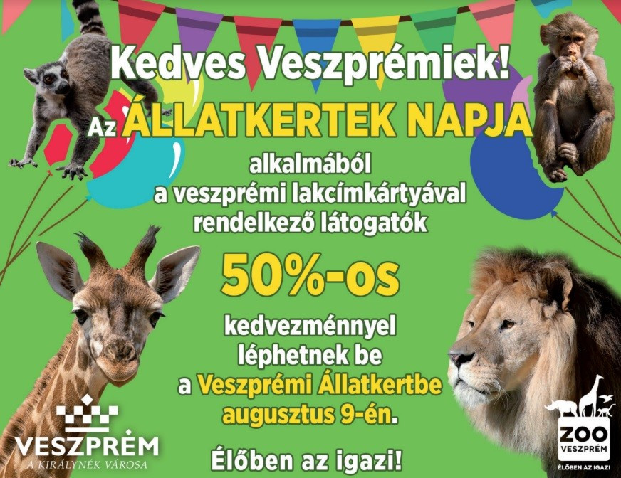 augusztus 9-én minden veszprémi lakcímkártyával rendelkező személy 50%-os kedvezménnyel tudja meglátogatni az állatkertet.