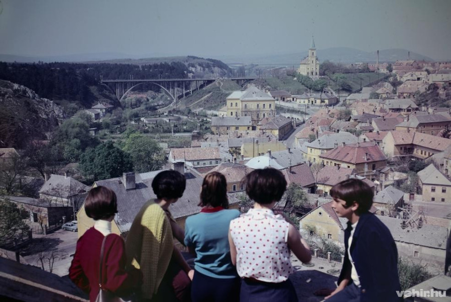 1962. Magyarország,Veszprém kilátás a Várkilátóból a Szent István völgyhíd (Viadukt) és a Szent László-templom felé.