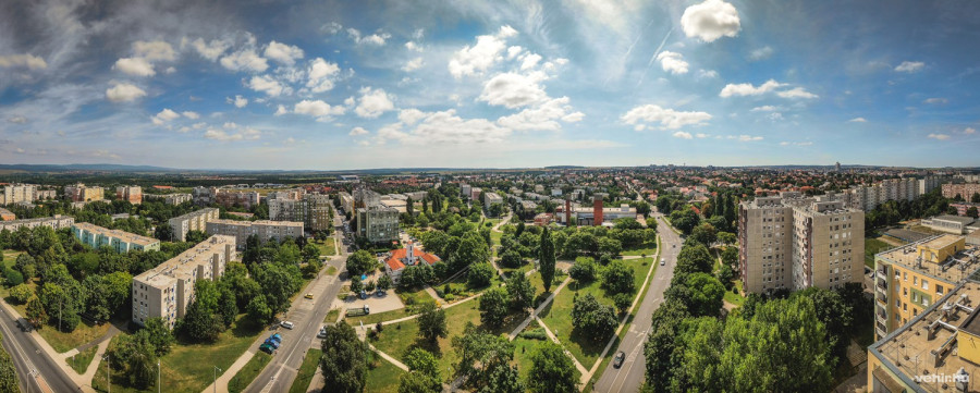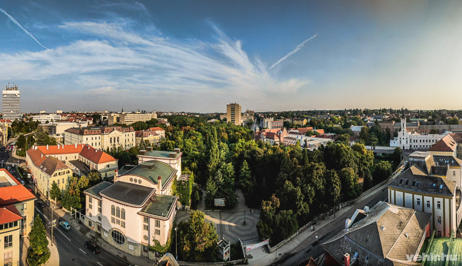 A Színházkert és az Erzsébet-liget zöld fáival vagyunk majdnem egy magasságon.