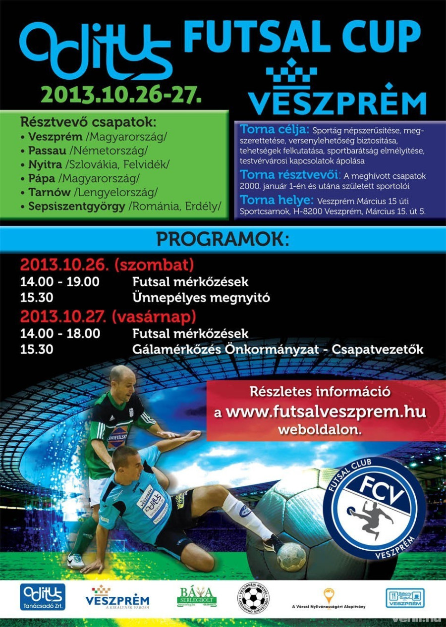 Veszprém és testvérvárosai, valamint Pápa részvételével hatcsapatos futsalkupát rendeznek október 26-27-én a Március 15. utcai sportcsarnokban.