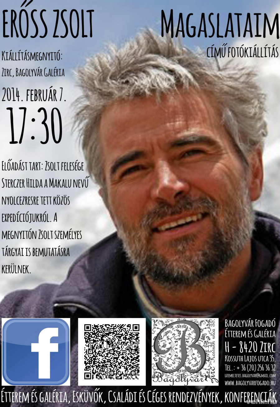 Február 7-én (pénteken) 17:30-kor fotókiállítás nyílik a zirci Bagolyvár Galériában, amelyen Sterczer Hilda mutatja be Erőss Zsolt néhány személyes tárgyát. A megnyitót követően pedig a Makalu nyolcezres csúcsára tett közös expedíciójukról tart előadást.