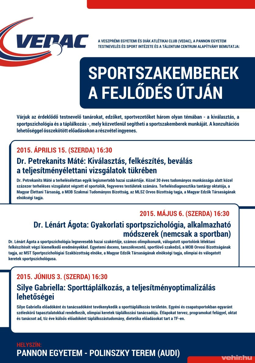 A Veszprémi Egyetemi és Diák Atlétikai Club (VEDAC), a Pannon Egyetem Testnevelés és Sport Intézete és a Tálentum Centrum Alapítvány együttműködéseként létrejött program keretében szakmai előadásokon és konzultációkon vehetnek részt az érdeklődő sportszakemberek: testnevelő tanárok, edzők, sportvezetők, sőt, maguk a sportolók is.