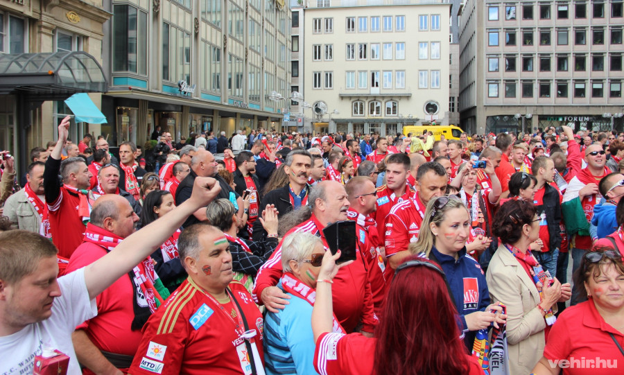 A veszprémi meccsek kommentátora, Mosonyi József hangolja a publikum szépszámú magyar hányadát. Kölnben is szépen szól a „hajrá Veszprém”!