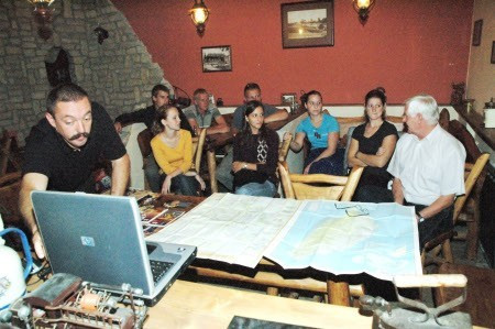 Ékes József az ajkai néptáncosokkal beszél a magyar hétről