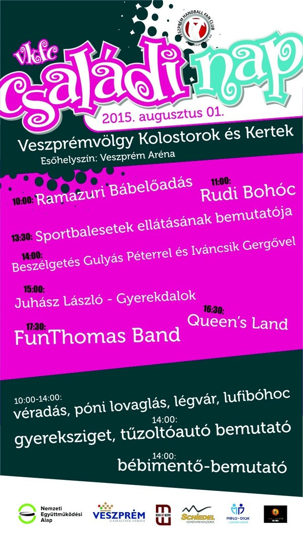A VKFC még az utolsó napokban is várja amatőr fellépők, énekesek, zenei előadók és pantomimok jelentkezését a – Man at Work, a Meló-Diák és a Schiedel Kéménygyár Kft. által támogatott – családi napra, amin a Csemete Alapítványtól érkező gyermekek étkeztetését az Allegro Café és Étterem biztosítja. Érdeklődni a veszpremkfc@veszpremkfc.hu e-mail címen lehet.