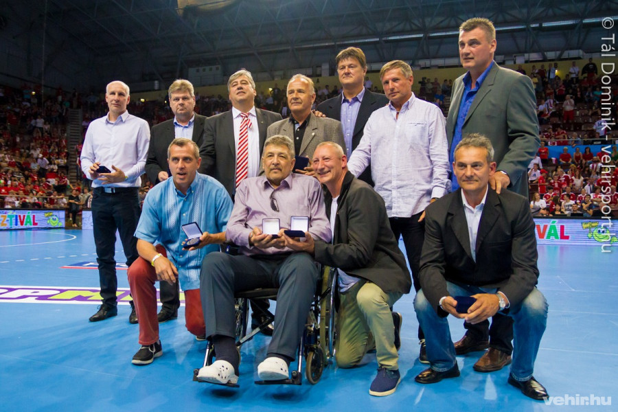 A szünetben az „elődöket”, a harminc évvel ezelőtt vb-ezüstérmet szerző férfi válogatott jelen lévő tagjait köszöntötték.