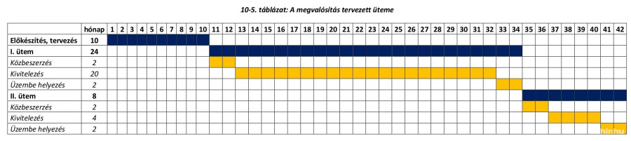 Az ütemezés alapján a projekt előkészítése, azaz a tervezés, engedélyeztetés 10 hónapot vesz igénybe. Ezt követi az 1. ütemre vonatkozó közbeszerzés lefolytatása majd a kivitelezés és üzembe helyezés, amely az előzetes tervek alapján 24 hónap alatt valósítható meg. A II. ütem kisebb volumenű beavatkozásai miatt a kivitelezés csupán 4 hónapot igényel, azaz összesen 8 hónap alatt elkészülhet. A mellékelt táblázatból kiderül: ha a Nemzeti Fejlesztési Minisztérium zöld utat ad a beruházásnak, terv szerint 34 hónap múlva adhatják át az uszodát. Ez nagyjából 2019 közepét jelenti, az első kapavágások pedig 13 hónap elteltével, valószínűleg 2018 tavaszán történhetnek.