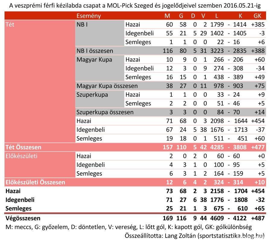 A 170. meccs következik a két legnagyobb rivális között, eddig 116 veszprémi siker, 9 döntetlen és 44 szegedi győzelem született – tudtuk meg a sportstatisztika.blog.hu szerkesztőjétől, Lang Zoltántól. Az összesített mérleg nyelve tehát jócskán a mienk felé billen, ez azonban közel sincs így a Szegeden lejátszott találkozók esetében. Ott ugyanis 27 diadal és 6 pontosztozkodás mellett 38 alkalommal szenvedtek vereséget az „Építők”.