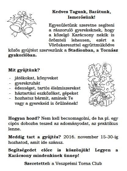 Az adományokat – játékot, könyvet, gyerekruhát, édességet, tartós élelmiszert, háztartási eszközt, gépet stb. – november 15-től 30-ig lehet átadni a veszprémi stadion tornász gyakorlójában.