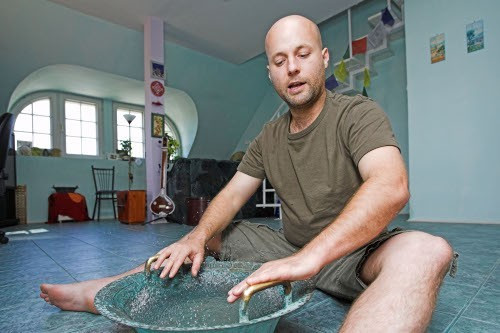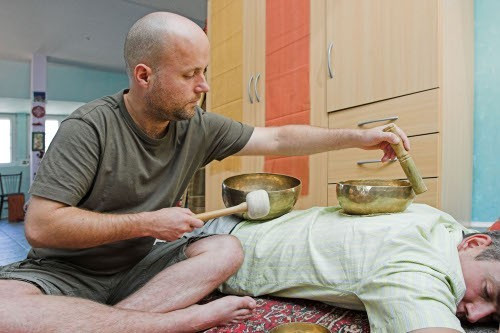 Ezután a házigazda lefektet a szőnyegre, ahol kerekded réztálak és egyéb hangeszközök vesznek körül. Becsukom a szemem, és ő hol a mellkasomra, hol a hasamra helyezi ezeket. Meg-megkongatja a testemen fekvő tálakat, melyek csilingelő, kongó-bongó hangon rezegtetik meg minden porcikámat. Csupán tíz percig tart a művelet, de egy órán át el tudtam volna viselni. Arnold magyarázatot is ad a hangmasszázs hatásaira.