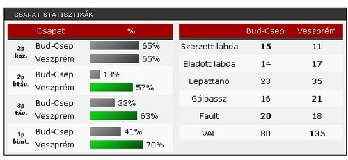 Veszprémi pontszerzők: Mérész 20, Bovánovics 19, Jilling 12, Nagy 2, Szabó 9, Pataki 21, Faragó .