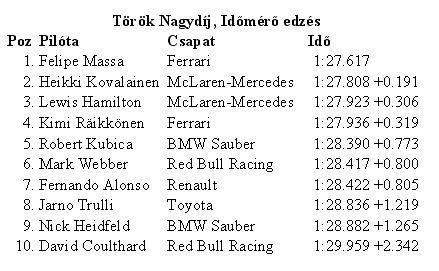 Kovaleinen és Massa az edzésen is izgalmas, parázs csatát mutattak be, remélhetőleg ez a holnapi futamon is hasonlóan alakul. A rajtrács második sorában lévő két vb-éllovas csatája is izgalmasnak ígérkezhet a Forma-1 szerelemesei számára. Robert Kubica ezúttal is megverte saját csapattársát, Nick Heidfeldet: a lengyelnek az ötödik rajtpozíciót sikerült megszerezni, míg a csapattársának csak a kilencedik hely jutott. A Red Bull Racing istálló mindkét pilótájának sikerült bejutni a Q3-ba, sőt Webber a hatodik helyet tudta megszerezni, ami bizakodásra adhat okot a Red Bull Racing drukkerei számára. A kétszeres világbajnok, Fernando Alonsonak csak a hetedik helyet sikerült megszereznie a Renault-val.