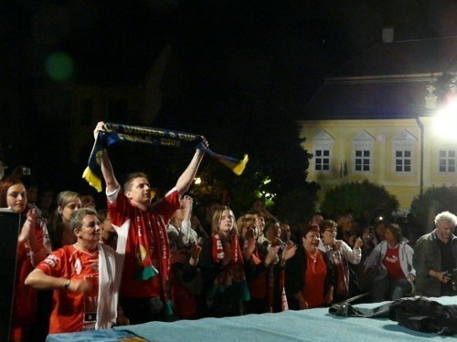 A hazai mérkőzésekről jól ismert „szpíker” Mosonyi József hatalmas ováció közepette egyesével szólította az alkalmi pódiumra a KEK hőseit. A siker kovácsai - játékosok, edzők, orvosok, vezetők - kifejezték örömüket, s megköszönték a veszprémi szurkolók buzdítását. Cozma és Vujin különösen „elemében volt”, a két kiválóság táncra perdült, illetve dalra is fakadt, produkciójuk közönségsiker lett. Az első sorokban állók közös pezsgőzés részesei is lehetettek, az ünnepi nedűt azonban nem a szokványos módon fogyaszthatták el, hanem „égi áldásként” jutottak hozzá néhány játékosok jóvoltából.