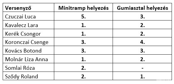 A népes mezőnyben remek versenyzéssel kiváló veszprémi helyezések születtek mind a minitrampon, mind a nagy gumiasztalon folyó küzdelemben. A szakág négy arany-, öt ezüst- és négy bronzmedállal, valamint egy negyedik és egy ötödik helyezéssel tért haza, megkoronázva egész éves munkáját.