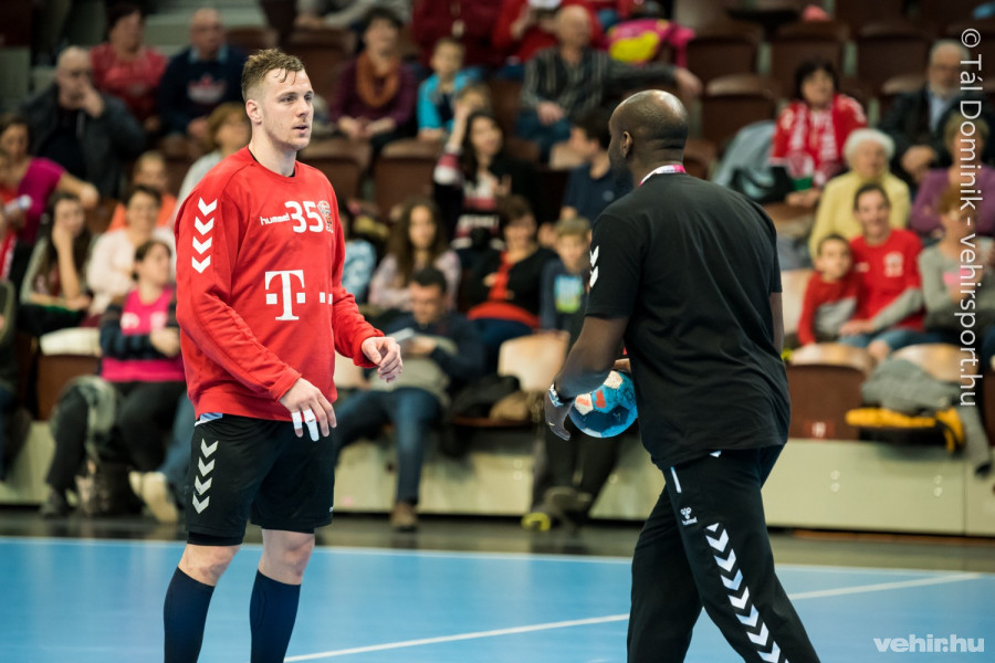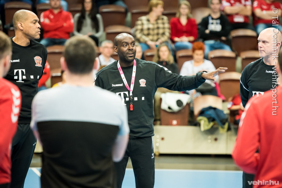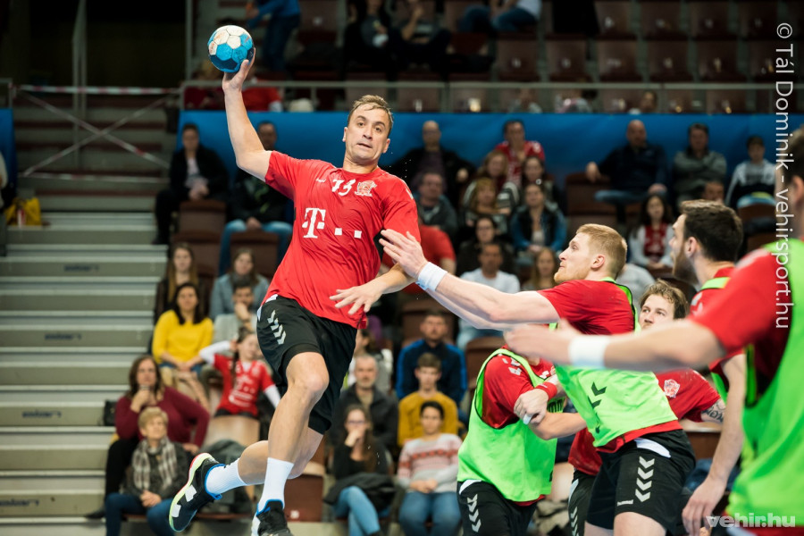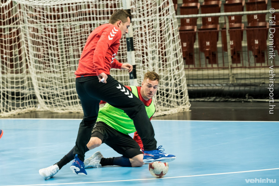 A folytatásban természetesen már a kézilabdáé volt a főszerep: az egyik térfélen egykapus játék zajlott Mikler Roland ketrece előtt, a másikon pedig a négy szélső gyakorolt külön előbb Sterbik Árpáddal, majd szerepet cserélt a két hálóőr.
