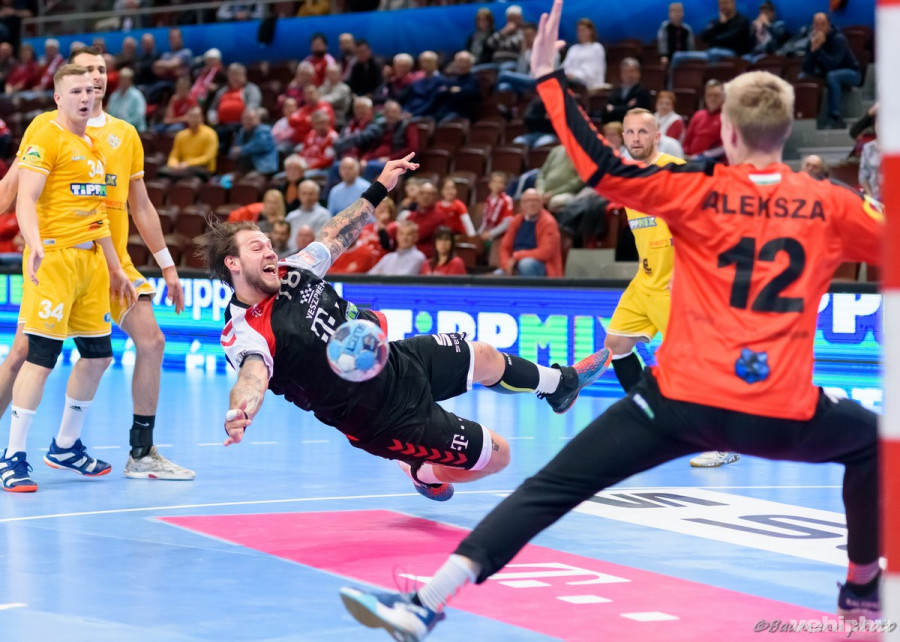 A felvonás hajrájában egyszerre volt a pályán a Szűcs, Szuharev, Melnyicsuk trió, melynek utóbbi tagja eredményes is tudott lenni. Nenadics a 200. veszprémi gólját szerezte, stílszerűen „kínaiból”, Sterbik pedig védte Pocsai büntetőjét a félidei pihenő előtt.