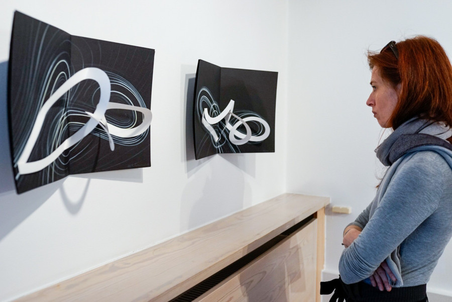 Haász Katalin 1998-ban festett először Möbius képet, ami azóta is központi témája. A szombat délután óta a veszprémi Vass-Gyűjteményben megnyílt Pillanatok műve című kiállításon bemutatott festmények ezen szalagon alapuló vonalrendszer használatával jöttek létre.