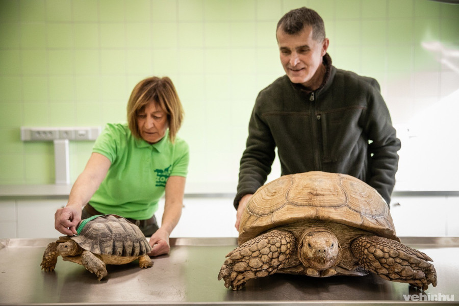 A banánszeletekkel való hívogatás a katták népes családjánál is bevált: a vidám kis állatok marokházi Katalin vezetőápolóval közösen álltak mérlegre, hogy egy egyszerű kivonás után az ő súlygyarapodásuk is nyomon követhető legyen. Hasonló módszerrel állt mérlegre a sarkantyús teknős is, igaz, a közel 70 kilós szépség méredzkedése már kétemberes feladat volt. A derékbőség-mérésen az óriásteknős páncélja hosszában 84 cm-t, míg keresztben 83 cm-t eredményezett.