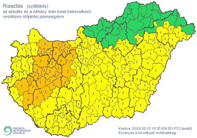 Az Országos Meteorológiai Szolgálat narancs riasztást adott ki megyénk járásaira. Hétfőn délutánig a délnyugati szelet kísérő lökések az ország nagy részén meghaladhatják a 60-70, leginkább a Dunántúli-középhegység térségében a 80-90 km/h-t. Délután északnyugatira, nyugatira forduló széllel hidegfront érkezik. A legerősebb lökések sok helyen várhatóan elérik a 70-90, elsősorban az Észak-Dunántúlon a 80-100 km/h-t. Hétfő estétől a front átvonultával átmenetileg veszít erejéből a szél, majd kedden reggeltől ismét sokfelé (legkevésbé délnyugaton) viharossá fokozódó északnyugati szélre lehet számítani, 65-90 km/h-s, az északi országrészben a magasabban fekvő hegyvidéki területeken 90 km/h-t meghaladó legerősebb lökésekkel.