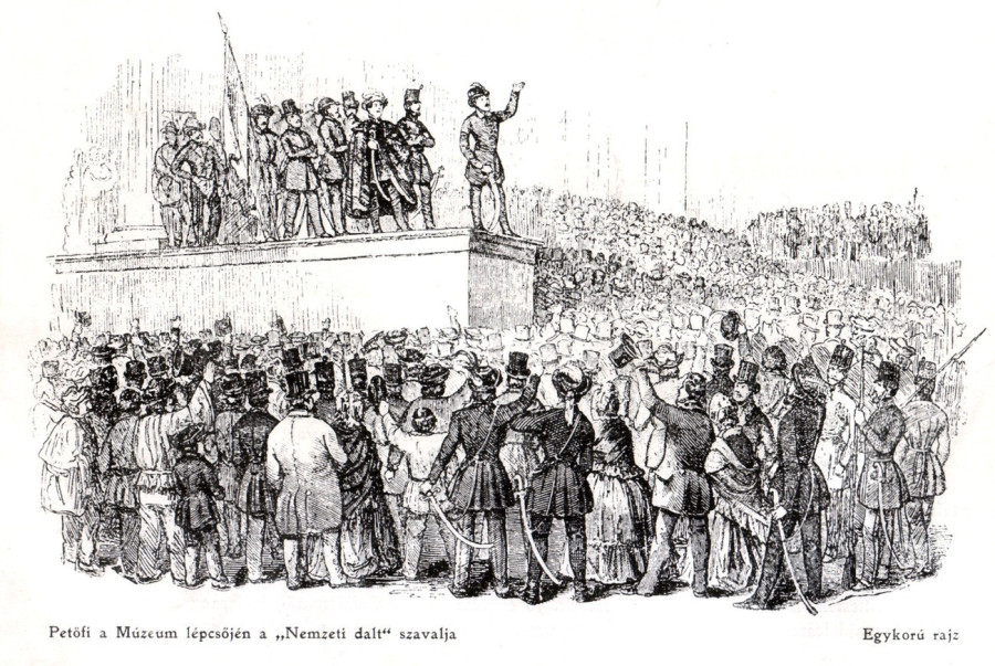 A korabeli ábrázolásokon sokszor látszik Petőfi, ahogy a Nemzeti Múzeum lépcsőjére kiállva szaval valamit, de ha jobban megvizsgáljuk a történelmi leírásokat és az akkori körülményeket, arra jutunk, hogy nagy valószínűséggel nem a Nemzeti dalt szavalta el, hanem egy buzdító beszédet tartott az összegyűlt tömegnek.
