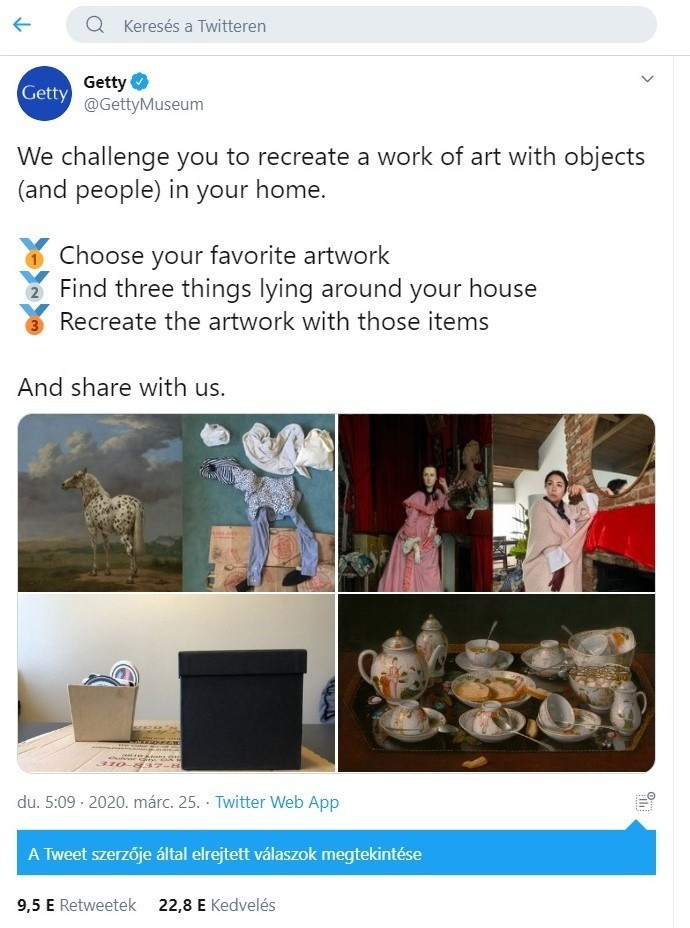Egy amerikai múzeum indította el karantén egyik szerintem legötletesebb kihívását. A Getty Museum challenge esetében a feladat: ki kell választani egy műalkotást, majd az otthonunkban kell találni három olyan kelléket, amik segítségével le lehet másolni, illetve újra lehet alkotni az adott festményt vagy műtárgyat úgy, hogy az valamennyire azért felismerhető is legyen.