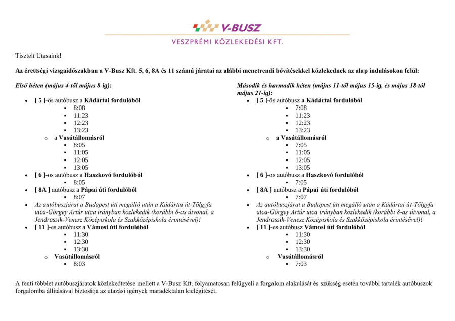 A V-Busz pedig május 4-8, május 11-15 és május 18-21 között több útvonalán is plusz járatokat indít, amelyek indulási idejérő az alábbi táblázatban tájékozódhatnak.