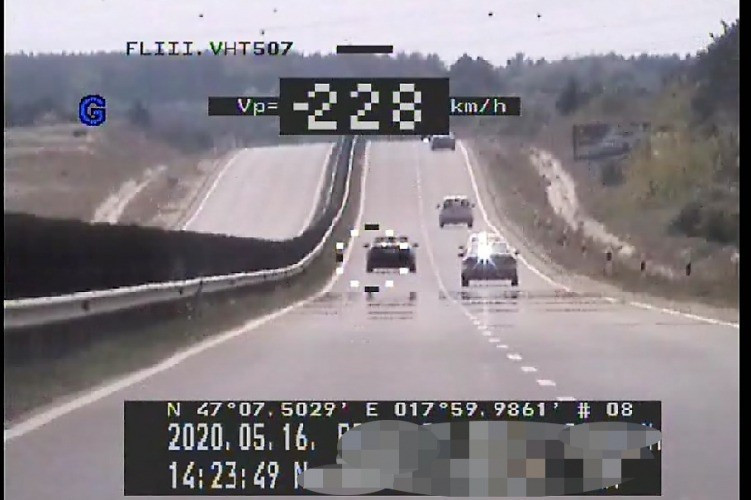 A Veszprém Megyei Rendőr-főkapitányság munkatársai szombat délután a nyolcason, Veszprém közelében mérték be az autóst, aki a megengedett legnagyobb sebességet (110 km/h), sőt annak dupláját is átlépve, 228 km/h-val közlekedett. A 33 éves gyöngyösoroszi sofőrt a rendőrök megállították, és háromszázezer forint közigazgatási bírságot szabtak ki vele szemben, illetve nyolc büntetőpontot kapott.