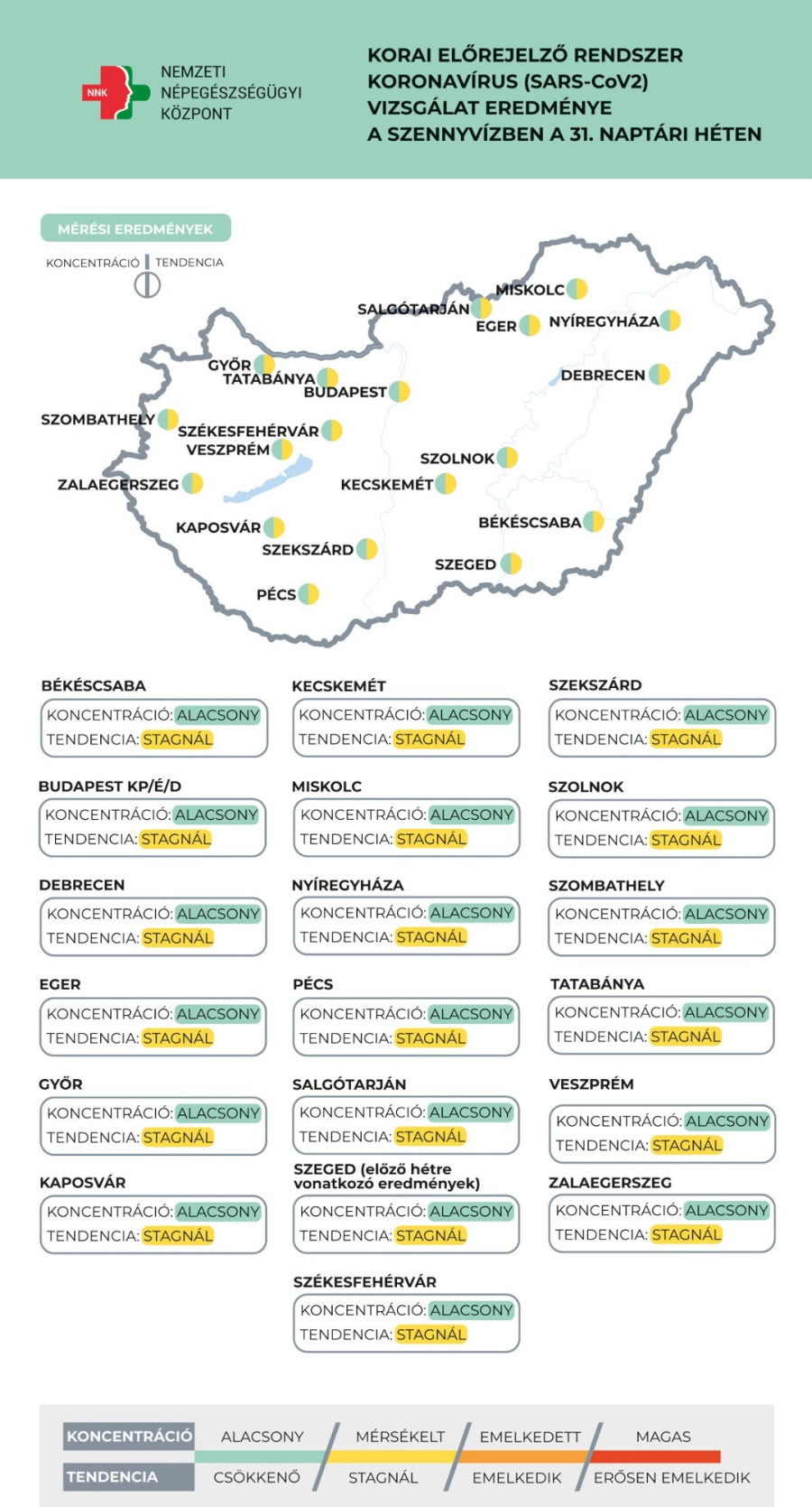 A Nemzeti Népegészségügyi Központ tájékoztatása alapján az egész ország területét lefedő, friss adatok azt mutatják, hogy a vizsgált településeken a szennyvizekben mért vírus koncentrációja mindenhol továbbra is alacsony. A mérési eredmények minden esetben stagnáló tendenciát mutatnak. Ennek alapján nem várható jelentős emelkedés a megbetegedések számában a következő 1-2 hétben.