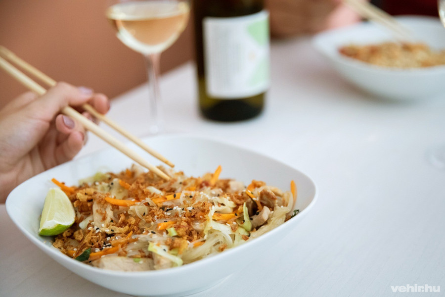 Beszélgetésünk végére meg is érkezett a konyhából a rizstésztás, kacsahúsos, korianderes ételünk, egy púpozott mélytányérban gőzölögve. Laikusként elsőre csak azt sikerült meghatározni, hogy egy tésztaétellel van dolgunk, hiszen egy klasszikus éttermi tányér helyett, ahol a rántott hús mellett jól elkülönítve megtaláljuk a hasábburgonyát, valamint a savanyút, itt egy komplex egytálételt kaptunk, amiben nem is érdemes keresgélni a különböző összetevőket, inkább azok egyvelegét kell élvezni.